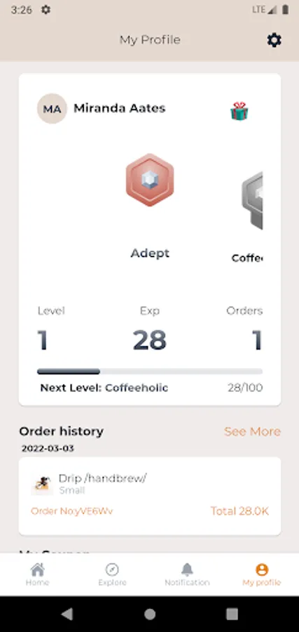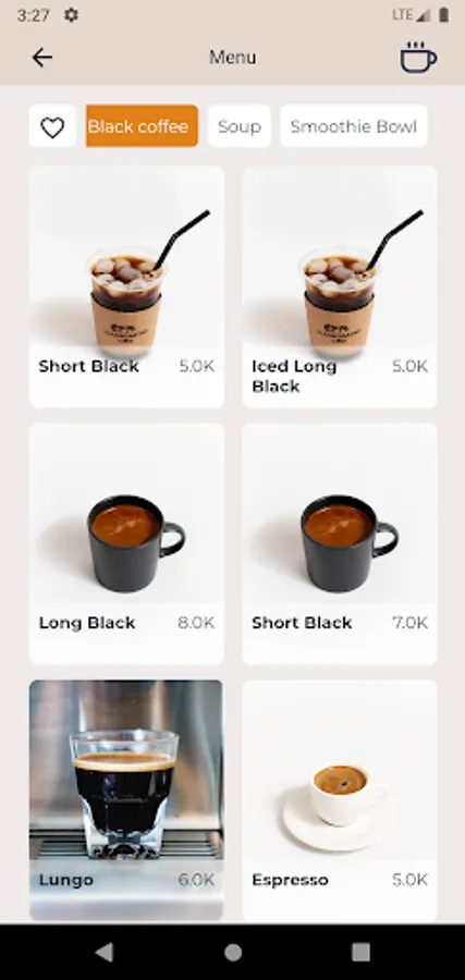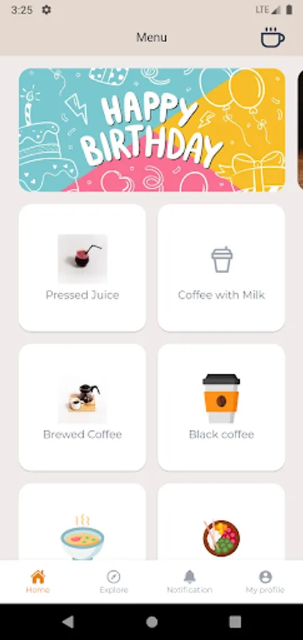 This application is intended for use in coffee shops and includes activities where users can view the menu, place orders and receive promotions.
