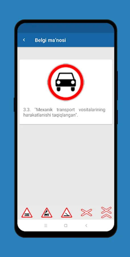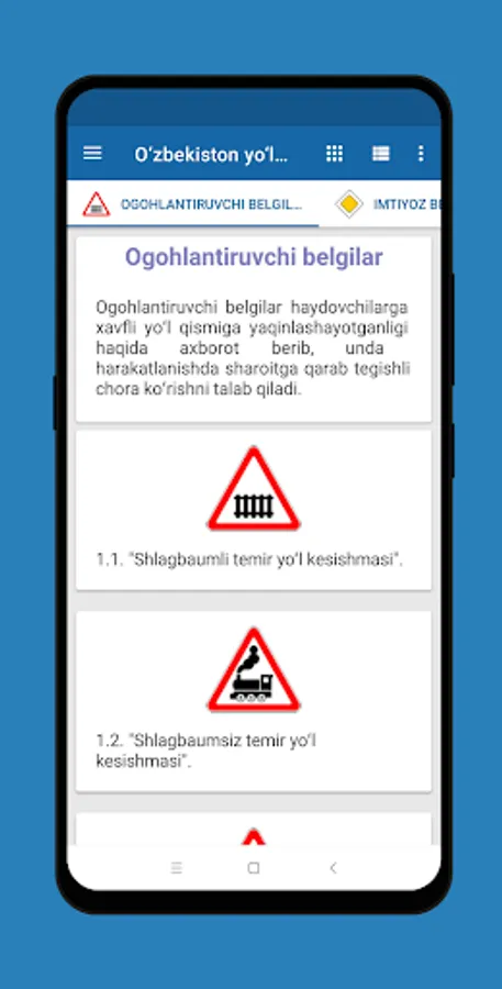 The application "Road signs of Uzbekistan - current catalog" allows you to study road signs offline, this is a convenient way to successfully study and improve your knowledge of traffic rules. This application is a textbook that allows you to remember traffic signs, undergo self-study and further obtain rights in accordance with the laws of the Republic of Uzbekistan.
