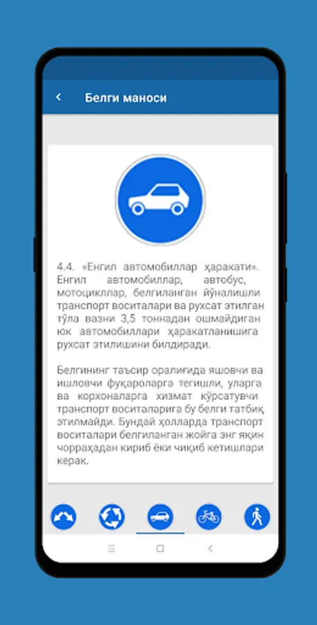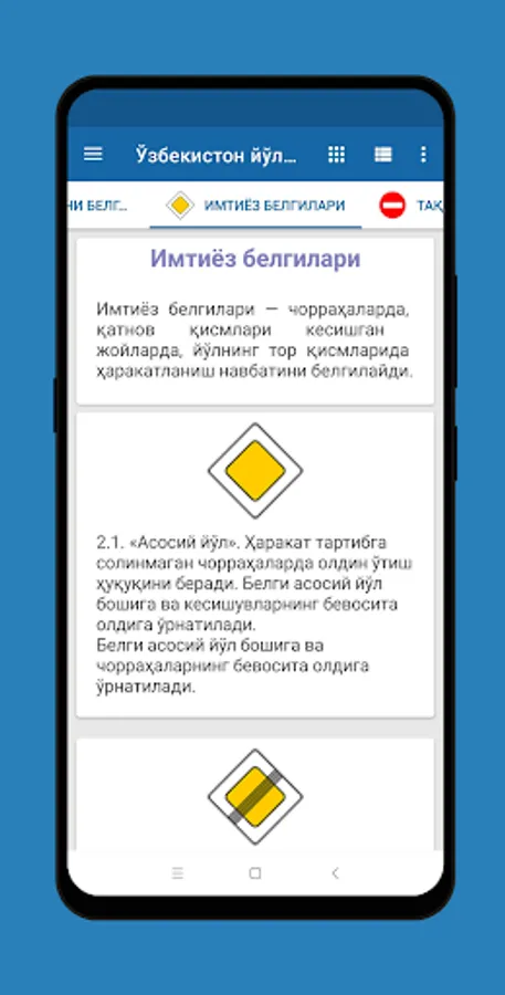 The mobile application helps to prepare for the exam in a driving school, assists in the study of road signs. The main advantages of the platform are its availability and completeness of the information provided in two languages (Uzbek, Russian) as well as in two alphabets for the Uzbek language (Latin, Cyrillic). The structure of the application is designed in accordance with user requests and helps to quickly find the information they need.