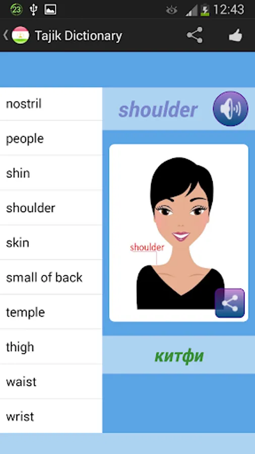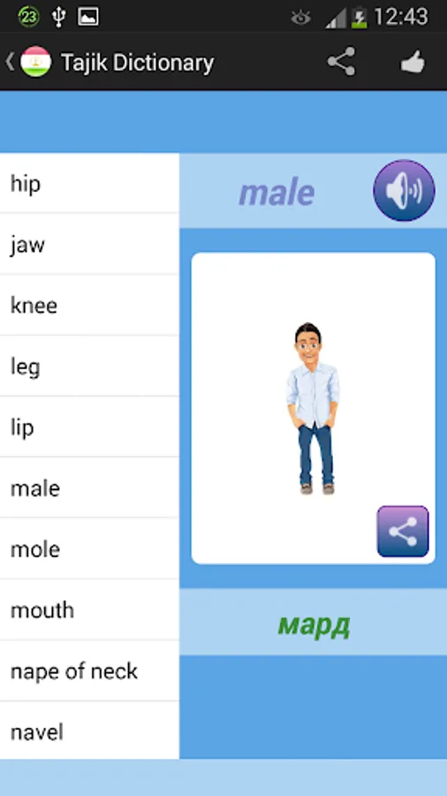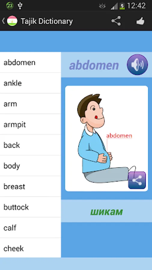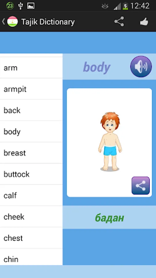Here is first version of Tajik dictionary here you can listen pronunciation of spelling English language, in this version only words about body of human, in the next versions will upload a lot of words, and you will have more possibility to improve your Tajik language!