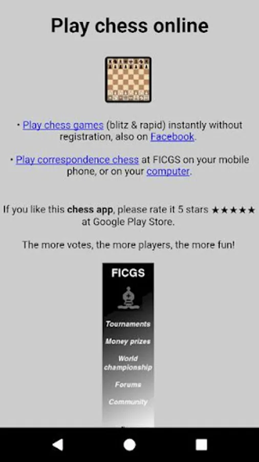 If you like this app, please give it five stars. This chess application may be not dedicated to all devices, please send an email to webmaster at FICGS.com if you encounter any problem, the author will try to fix it as soon as possible. You can find all FICGS chess apps at https://ficgs.com/