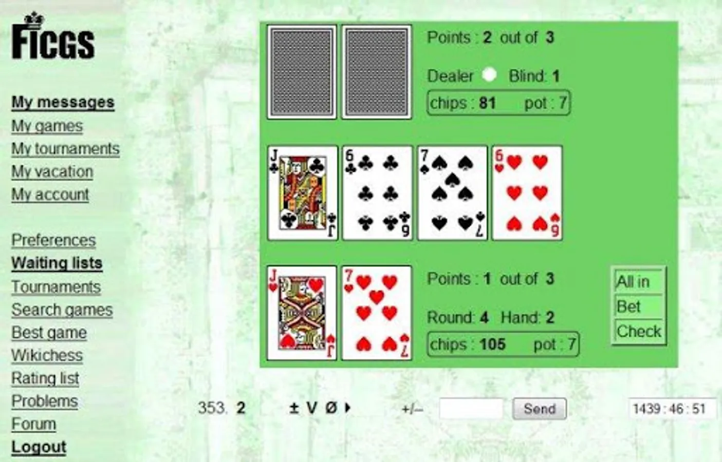 This poker app is just another way to reach the FICGS games (chess, Go & poker holdem) server, one of most serious places to play chess & Go. Before you're getting registered, you can play instant chess games if you like.