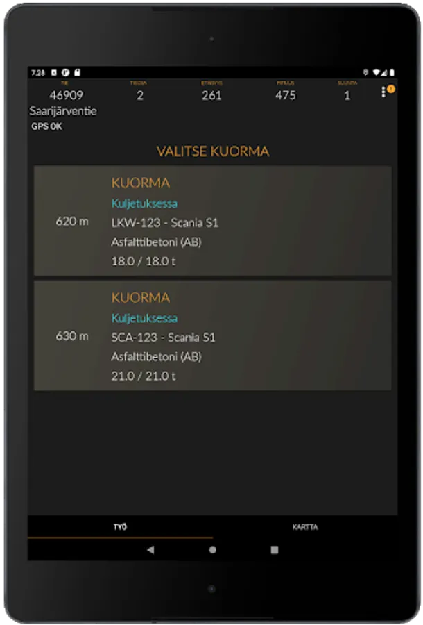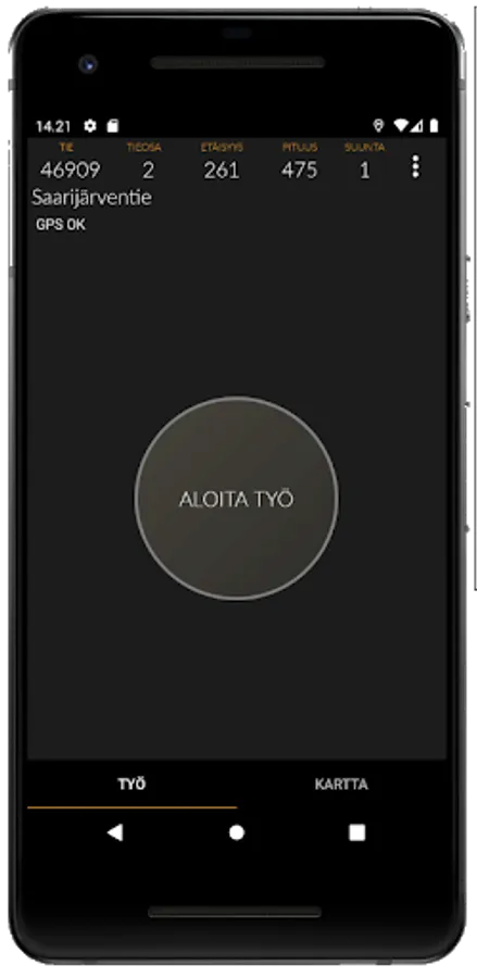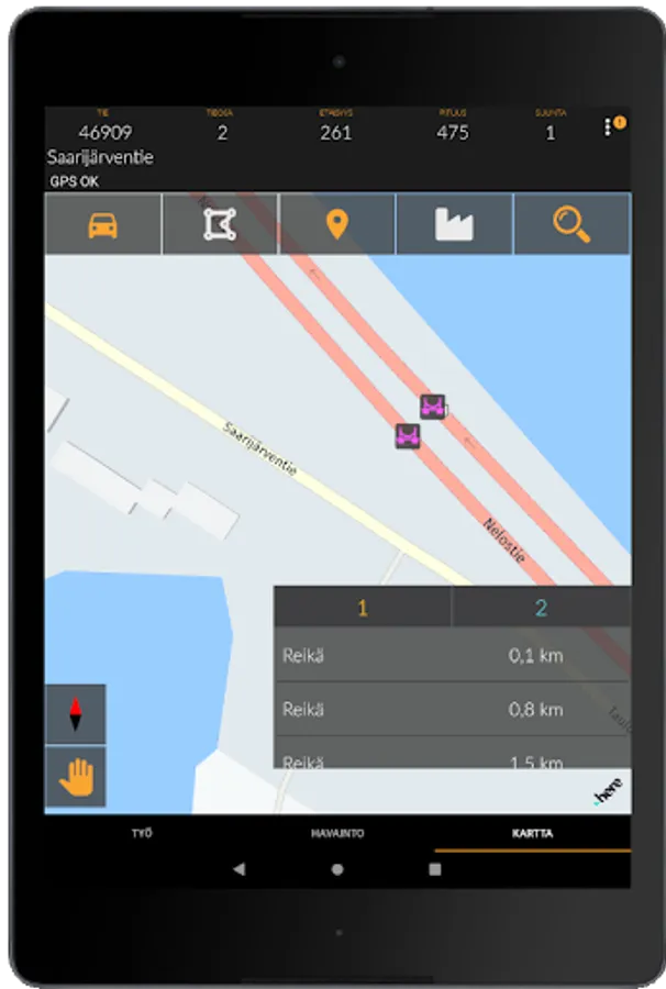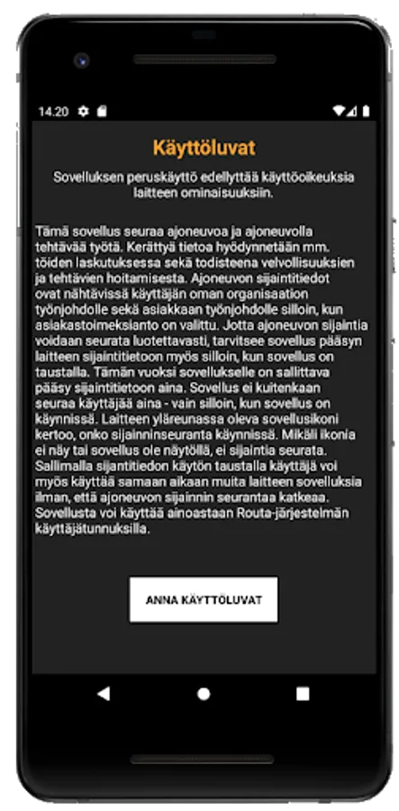 The application uses device location information for vehicle tracking and calculation of paving work information. In order for the vehicle and work tracking to function reliably and produce reliable data, e.g. for billing and job verification, the application also uses location information when running in the background. The application only tracks the location of the device while it is running, and location tracking can be stopped by closing the application or logging out. Use of the application and vehicle tracking is only possible with Routa system user IDs.