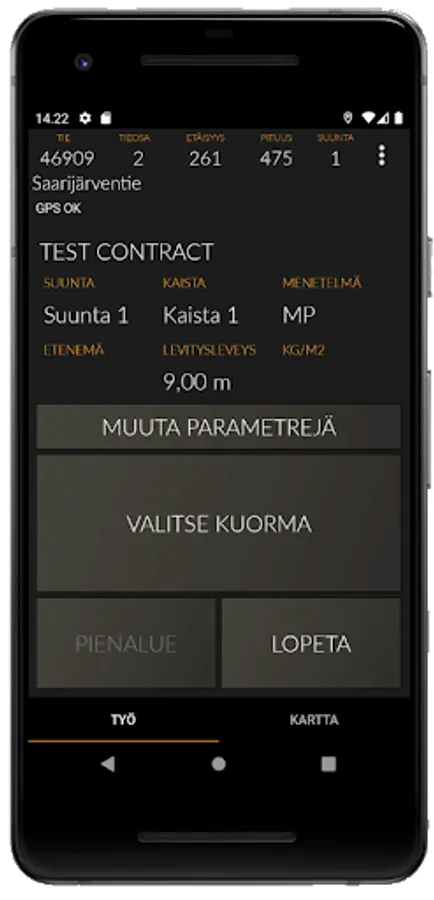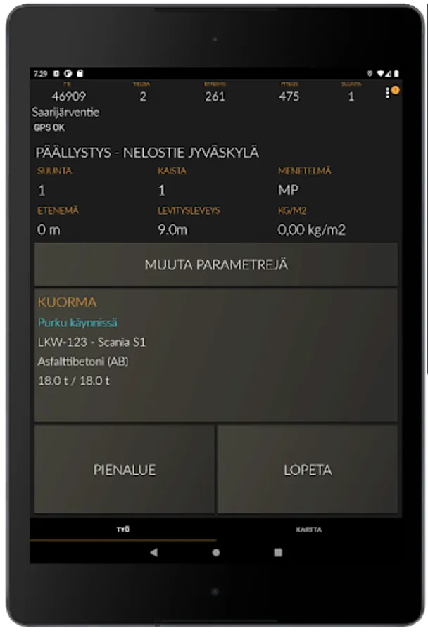 The application also monitors the location of the spreader and uses location information to measure e.g. paved distance and also the value of kg / m2 of paving work with the help of mass load data.