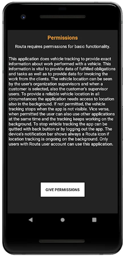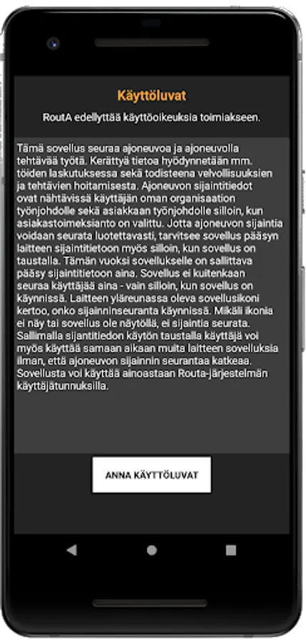 The application uses device location information for vehicle tracking. In order for the vehicle and work tracking to function reliably and produce reliable data, e.g. for billing and job verification, the application also uses location information when running in the background. The application only tracks the location of the device while it is running, and location tracking can be stopped by closing the application or logging out. Use of the application and vehicle tracking is only possible with Routa system user IDs.