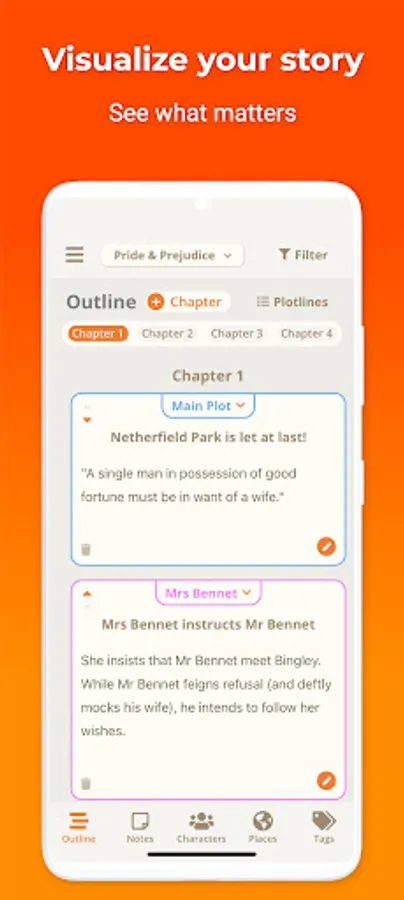 Want to see your entire story at a glance? Plottr automatically generates a clean outline of your story for you to review, edit, and export as the basis of your manuscript.