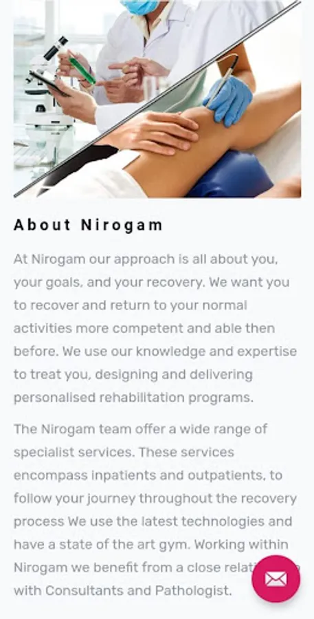The Nirogam team offer a wide range of specialist services. These services encompass inpatients and outpatients, to follow your journey throughout the recovery process We use the latest technologies and have a state of the art gym. Working within Nirogam we benefit from a close relationship with Consultants and Pathologist.