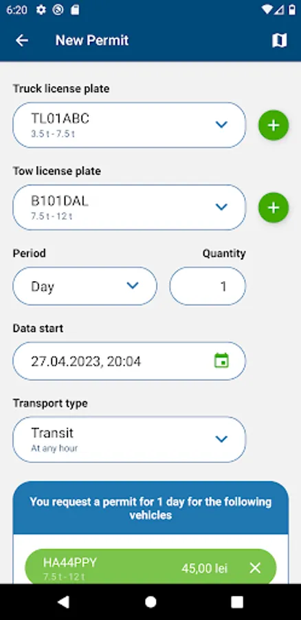 Do you own several vehicles and use them for transport or do you own a company and your employees use them for transport? Add all license plates in the app, both trucks and tows, and select the ones for which you want to generate a transport permit.