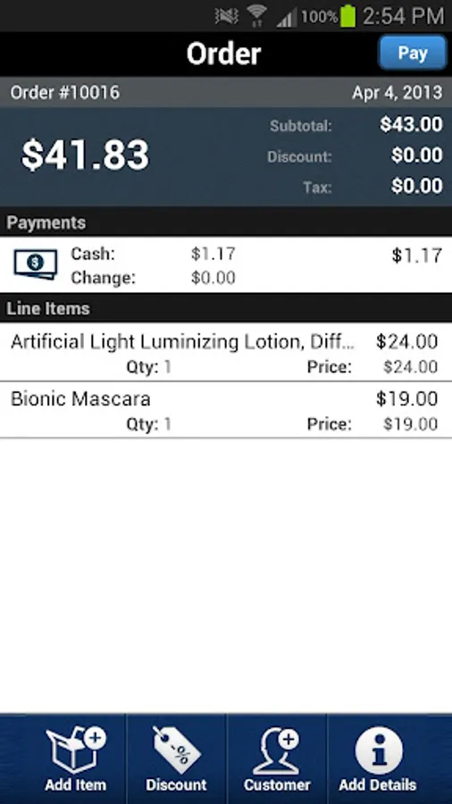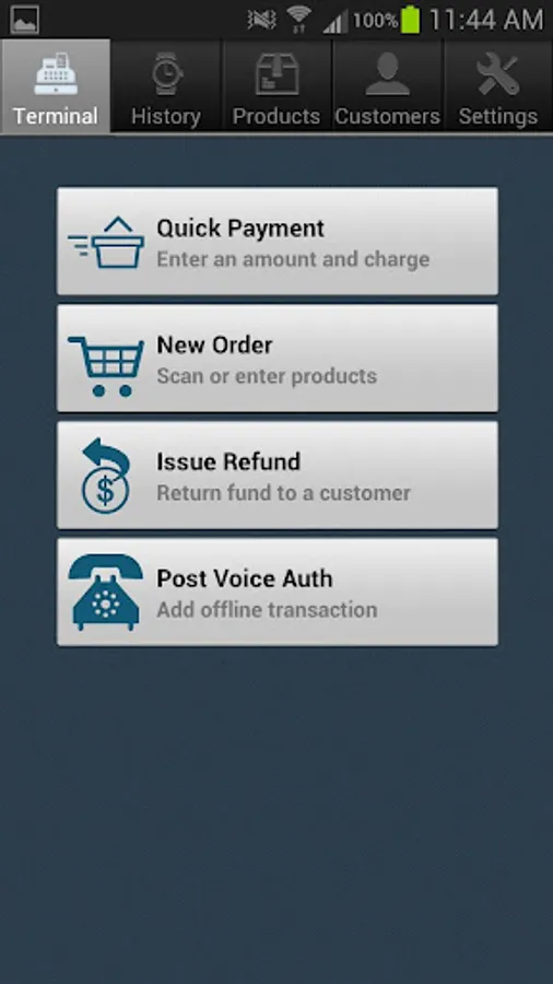 Provides a quick and easy interface for accepting credit card payments. Also includes a mobile point of sale (cash register) interface that supports inventory syncing, cash payments, tax calculation, order history and more. Supports bluetooth card swiper for better rates and printer for receipts.