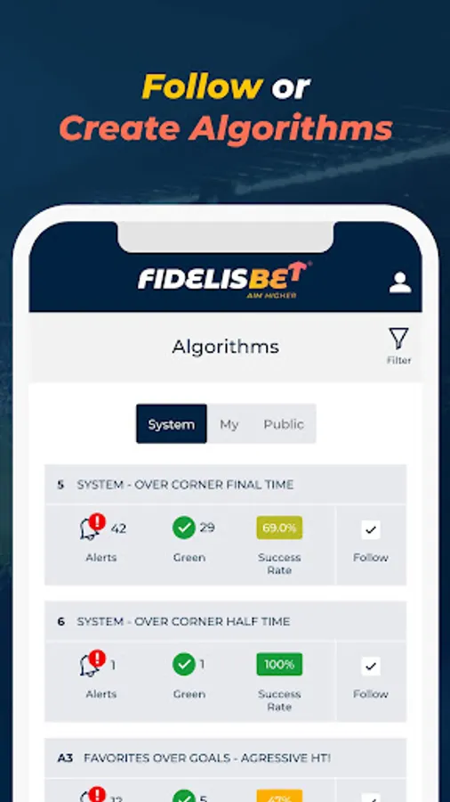 Public and Personal Algorithms - Do you feel you have the skills to build your own Algorithm? Perfect! You can build your own algorithms, using our extensive data collections. And if you are not comfortable yet, you can always subscribe to other Algorithms build by the FidelisBet community!