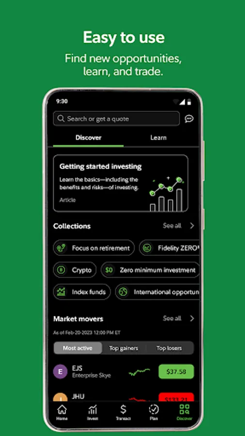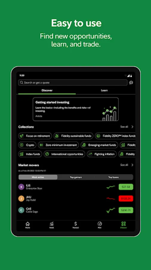 Invest at a firm invested in you. Fidelity’s secure and easy-to-use award-winning app gives you access to a broad choice of investments, expert insights, and investing tools—helping you make smart decisions with your money.