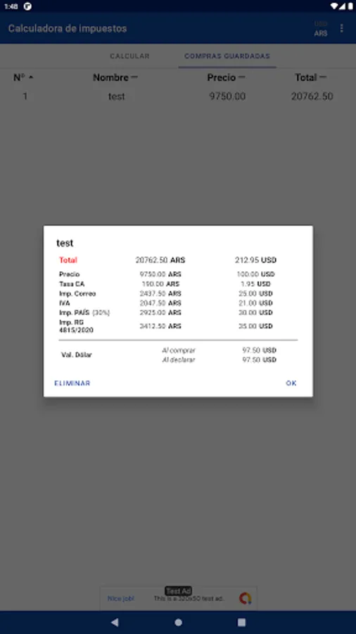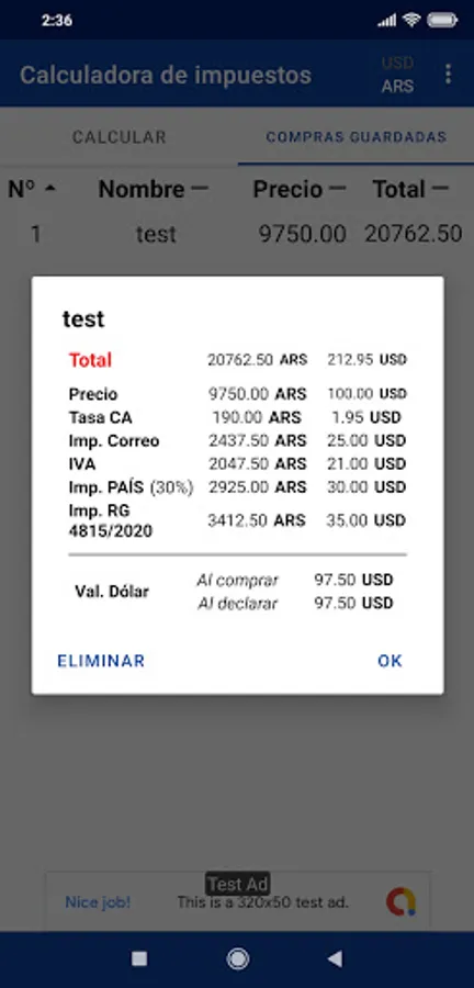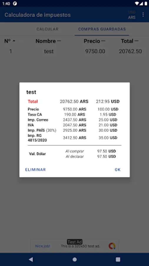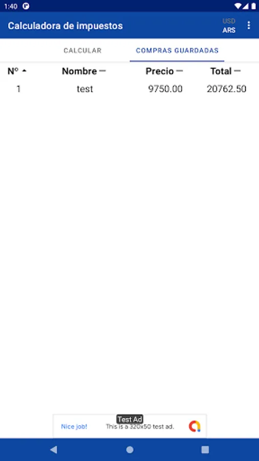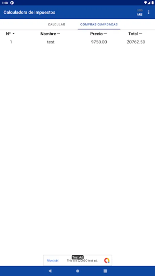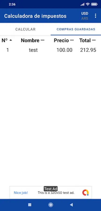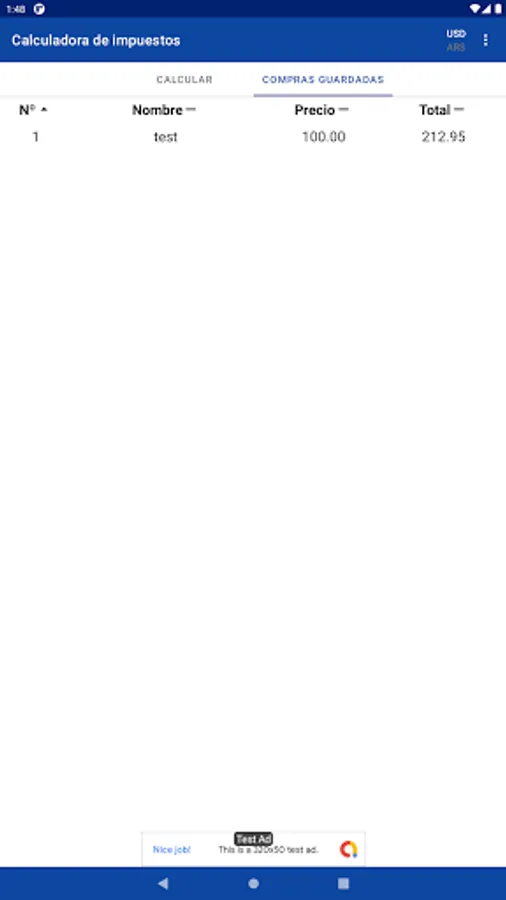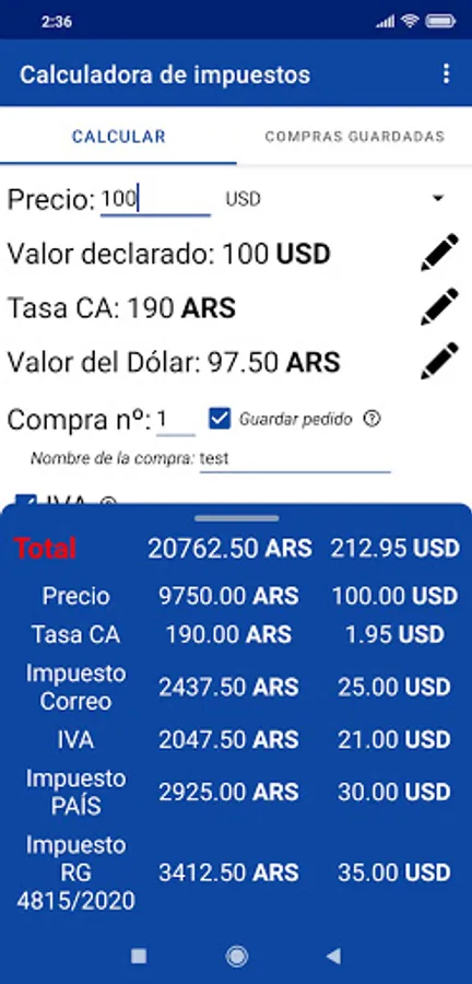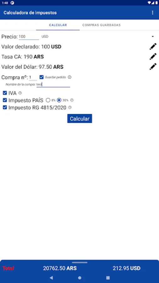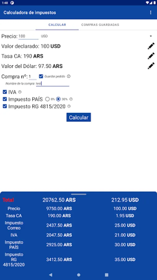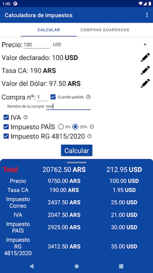 Furthermore, the app allows you to save and manage the calculated purchases, to see the information related to them in the future if desired. They can be sorted by purchase number, name, original price or final price, both in USD and ARS in the last two cases.