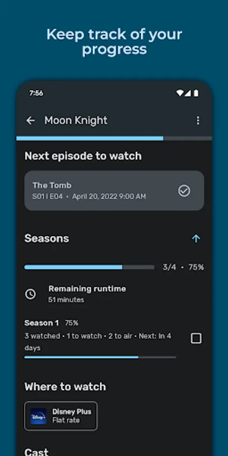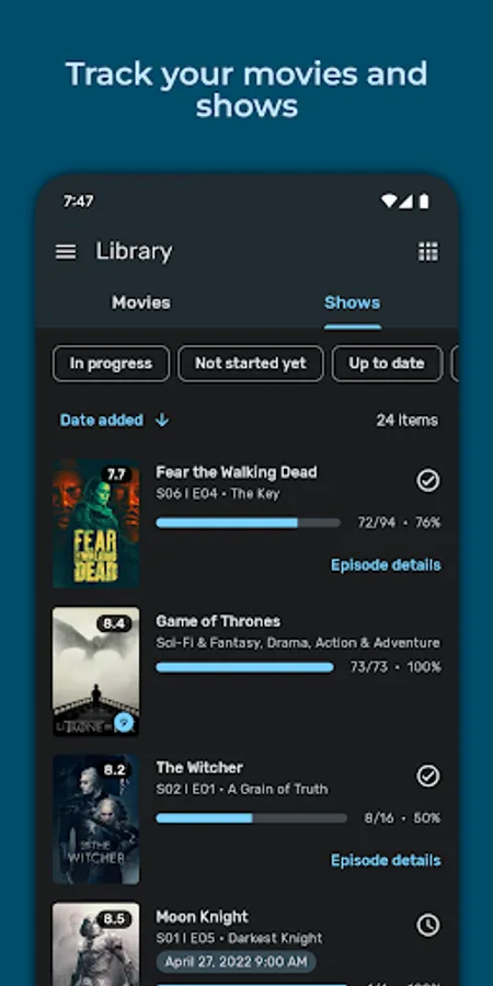 • Mark movies, TV shows, seasons and episodes as watched and build a complete history of what you have previously watched