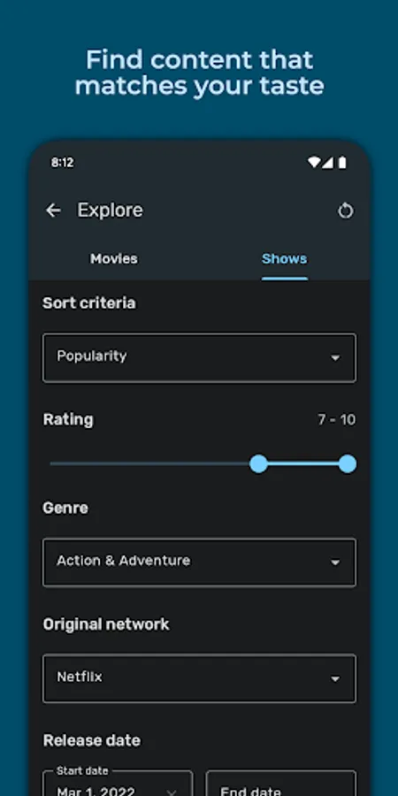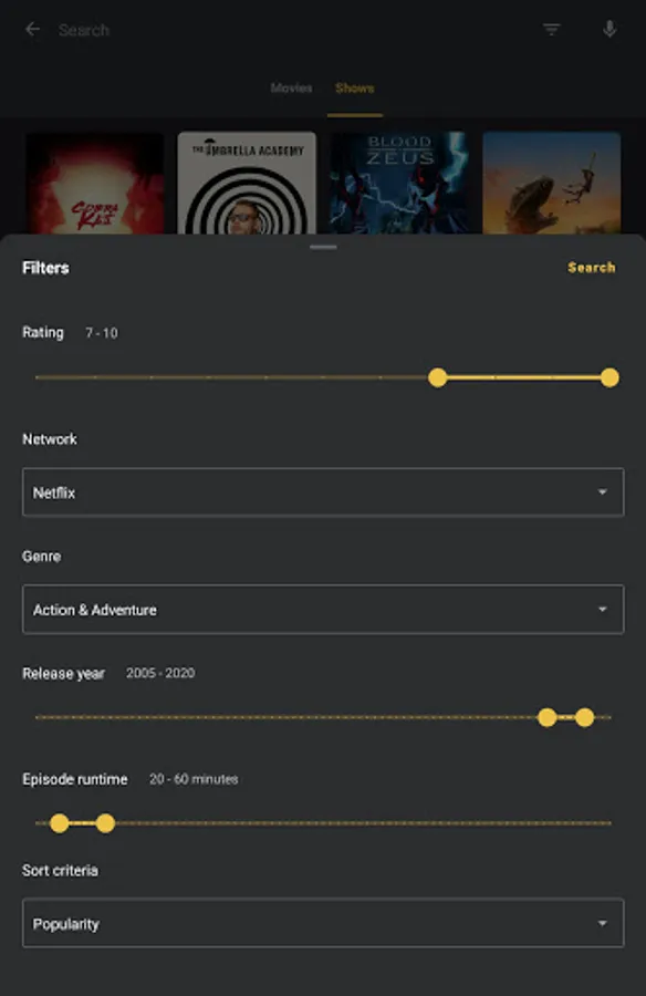 • Search movies and TV shows based on various criteria (name, genre, rating, streaming network, release date, episode runtime, movie runtime, etc.) and sort the result as you wish