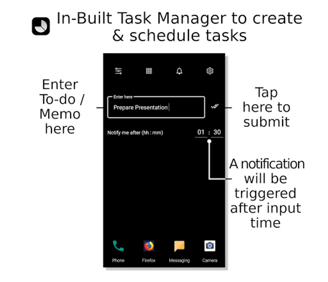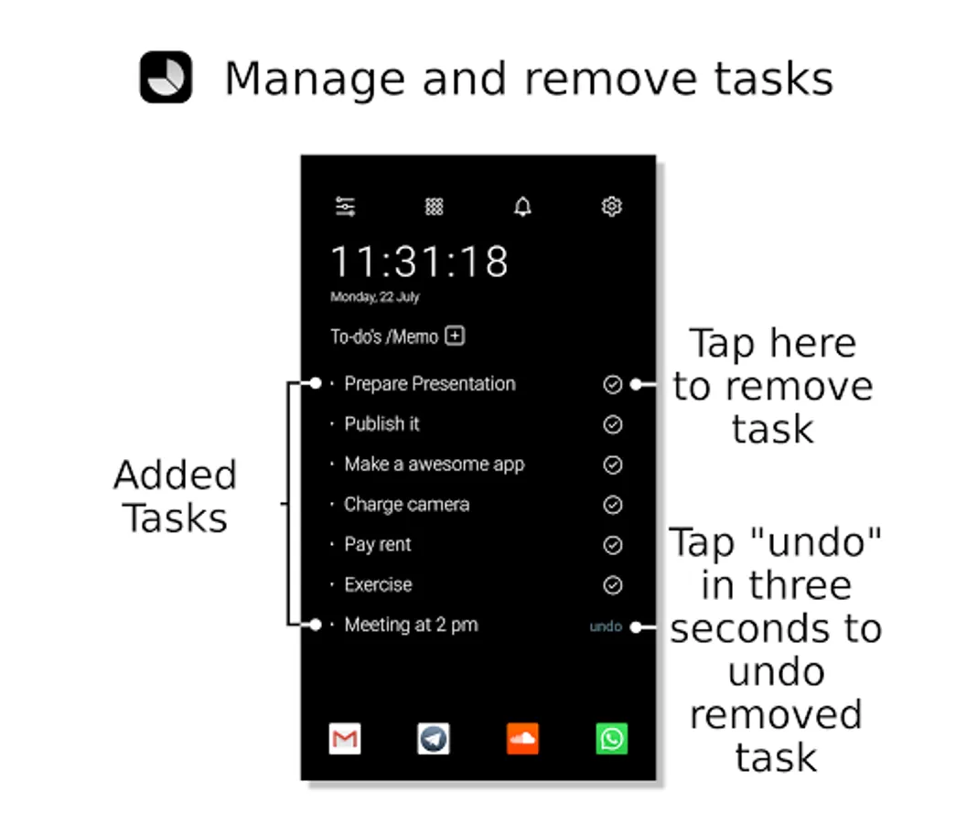 Ok, now when the clutter is gone, you may use our in-built task and memo creator so you can organize your days much better. Remember you have a big screen now free of widgets and apps! It’s a task creator and simple launcher in 1.