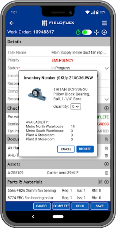 • Add communications, notes, resources, parts, materials, assets and time to work orders