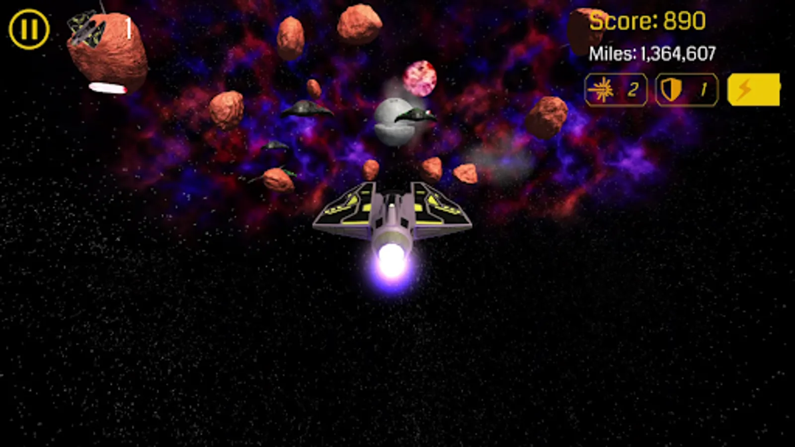 Rogue Jet Fighter is the most thrilling and exciting space shooting game out there. You abandoned your fleet to be on a mission of your own, to destroy one of the aliens powerful DeadMoon stations. These are powerful stations with the capability of destroying an entire fleet. But you have one powerful blaster bomb in your spaceship, you just have to get close enough to destroy it. This will not be easy; you will have to destroy and evade too many alien ships and asteroids.