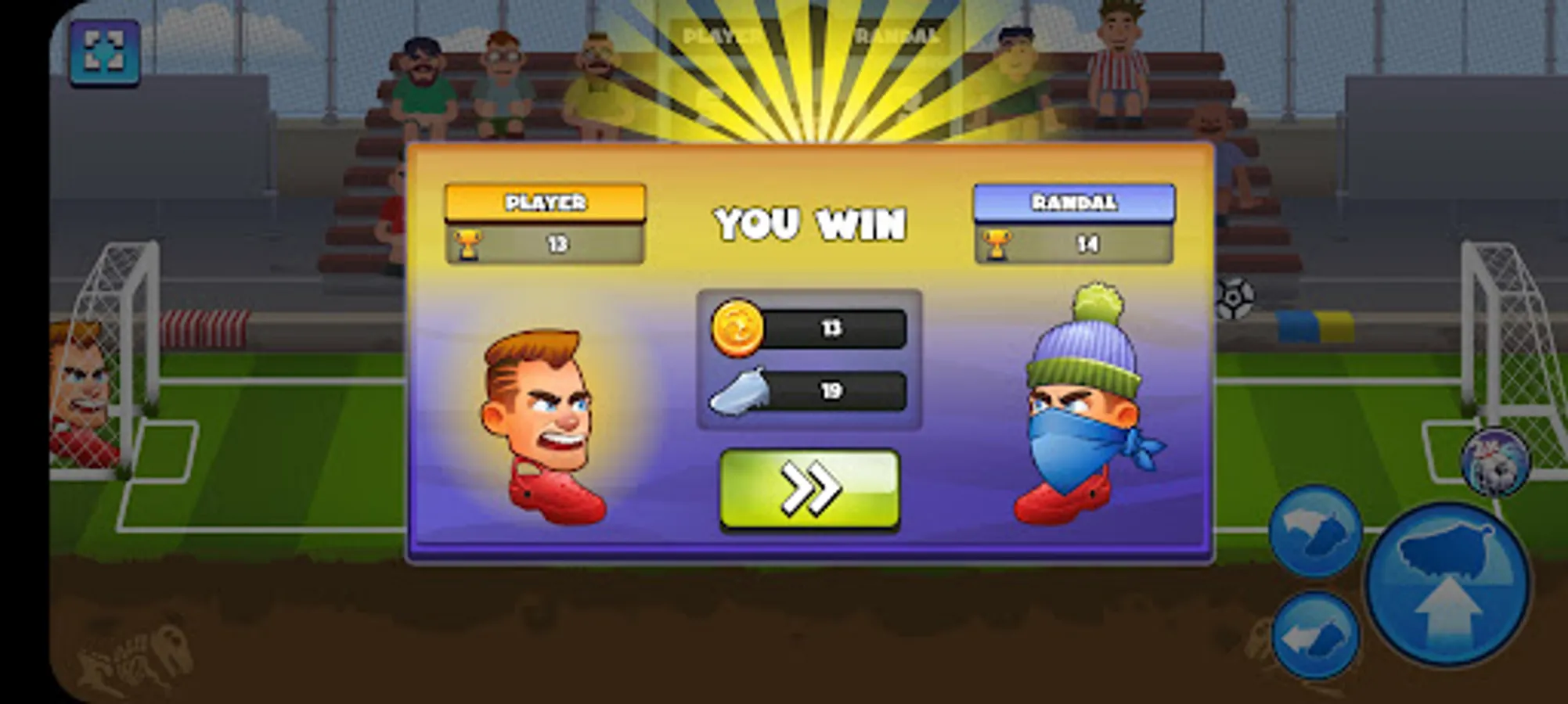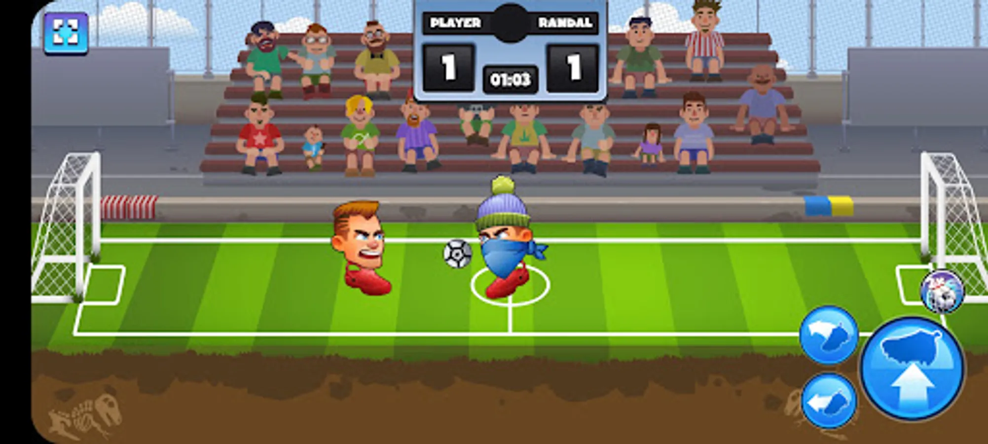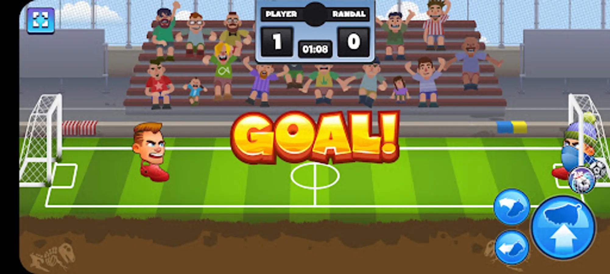 Move sideways and jump with the arrow buttons. Perform various kicks with the ball buttons. Score more goals in the given time and win the match. Climb divisions and unlock all rewards. Random match powerups and player emotes are available.