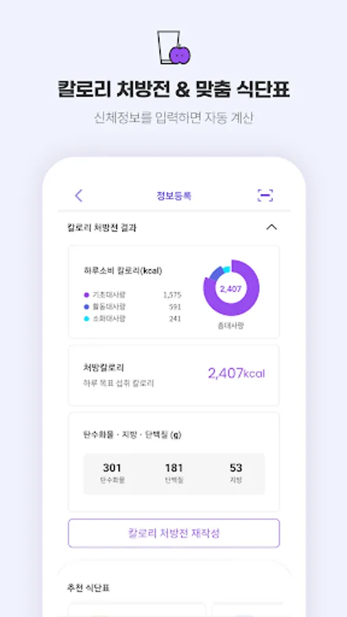 -Provides personalized dietary table for calories and 3 major nutrients (tan, sweet, fat) according to personal body information & purpose