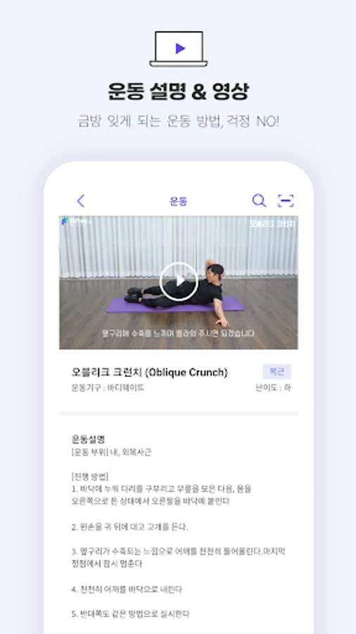 -Provides various exercise explanations and videos such as stretching, calorie consumption, and props