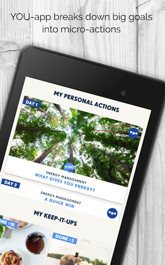 We all want a happy, fulfilled life, but knowing what to do on a daily basis is not always obvious. YOU-app’s solution is simple: don’t aim for drastic changes all at once. Instead, take many small steps, “micro-actions”, that over time add up to make significant change. One day the micro-action suggestion may be to enjoy a view; another to take a tech-free moment or go for a walk with a colleague.