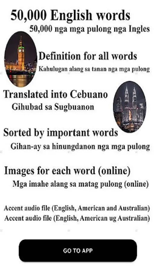 Ang 50,000 nga English nga mga pulong usa ka espesyal nga Diksyonaryo nga adunay mga litrato, kahulugan alang sa matag pulong ug adunay American, Australian, British nga paglitok