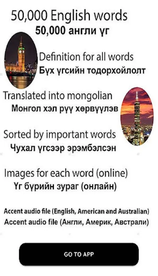 50,000 English words is a special Dictionary with pictures, definition for each word and with American , Australian , British pronunciation