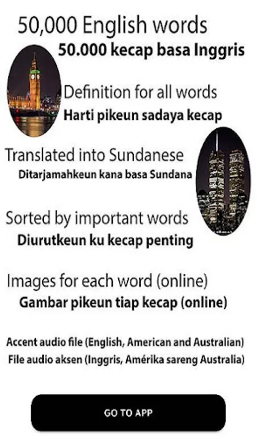 50.000 kecap basa Inggris nyaéta Kamus husus kalawan gambar, harti pikeun tiap kecap jeung jeung Amérika, Australia, ngucapkeun Inggris