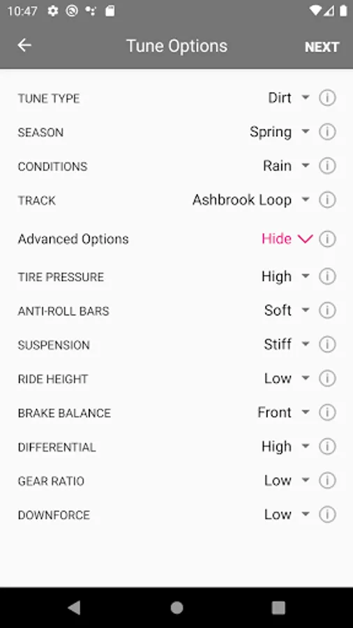 Further tuning options allow for custom tuning of tire pressure, anti-roll bars, springs and dampers, ride height, brake balance, differential, gearing and aero downforce.