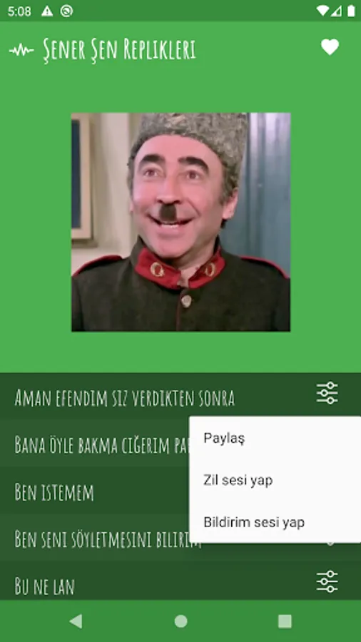 You can listen to voice lines from the movies played by Şener Şen, the unforgettable actor of Yeşilçam movies, share them, set them as ringtones or notifications.
