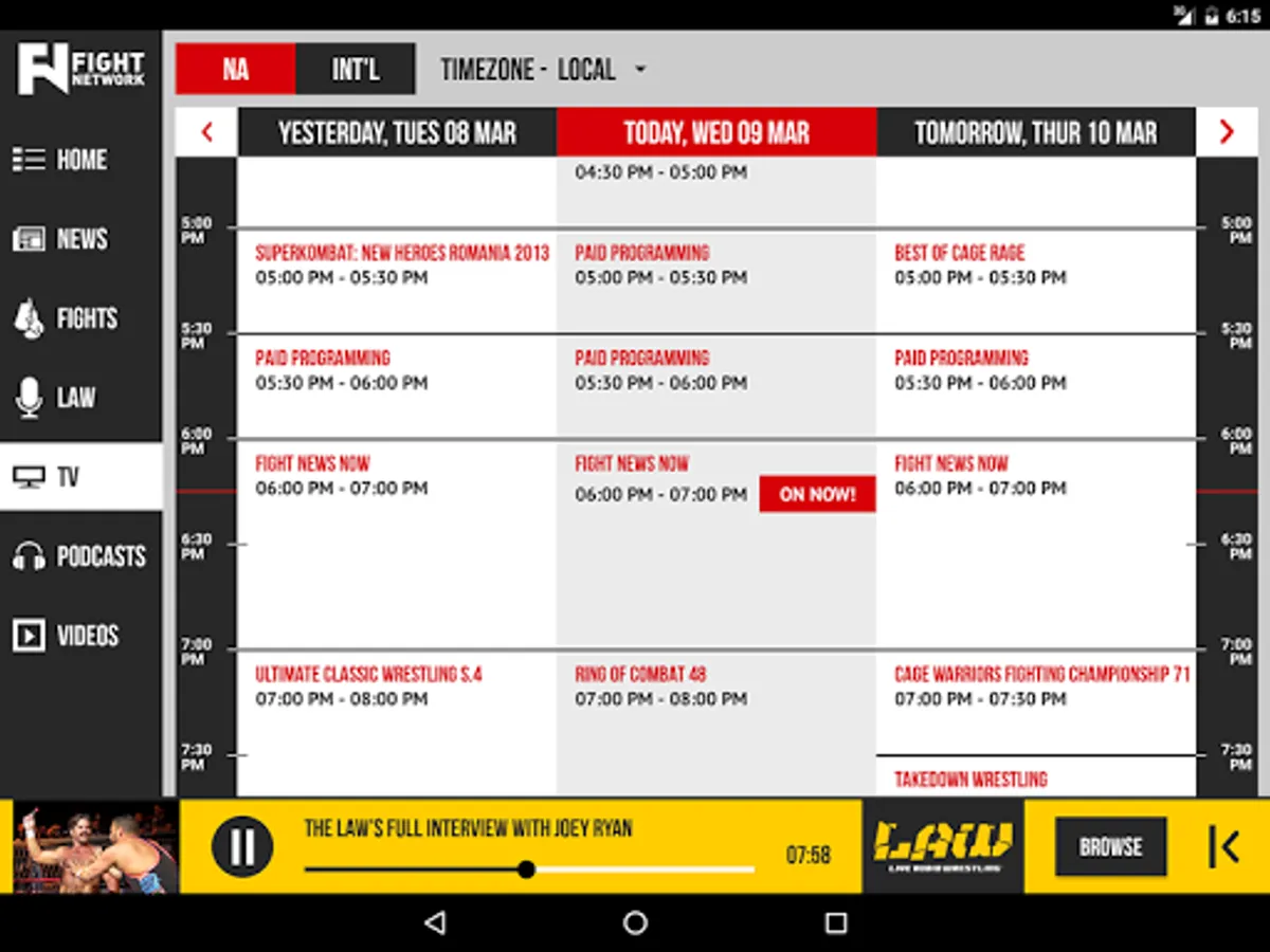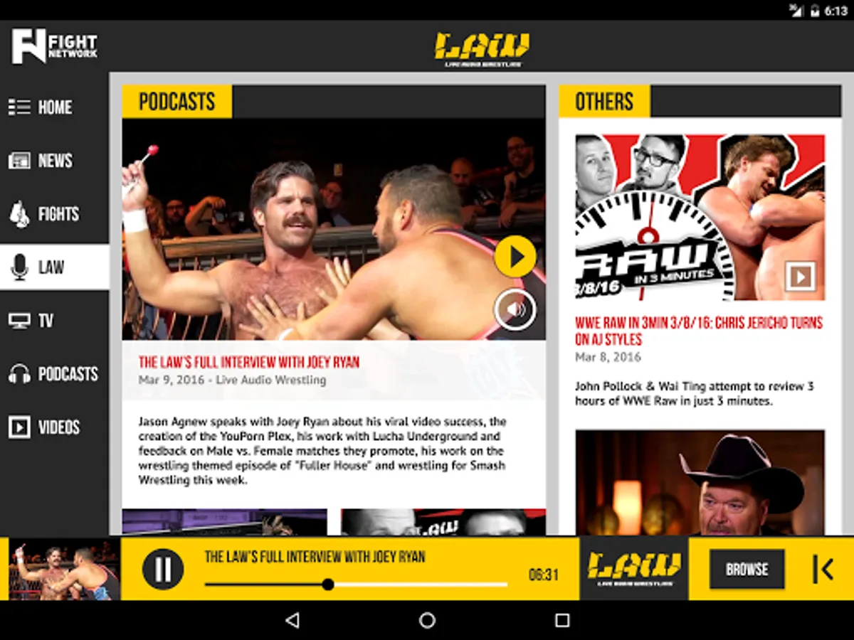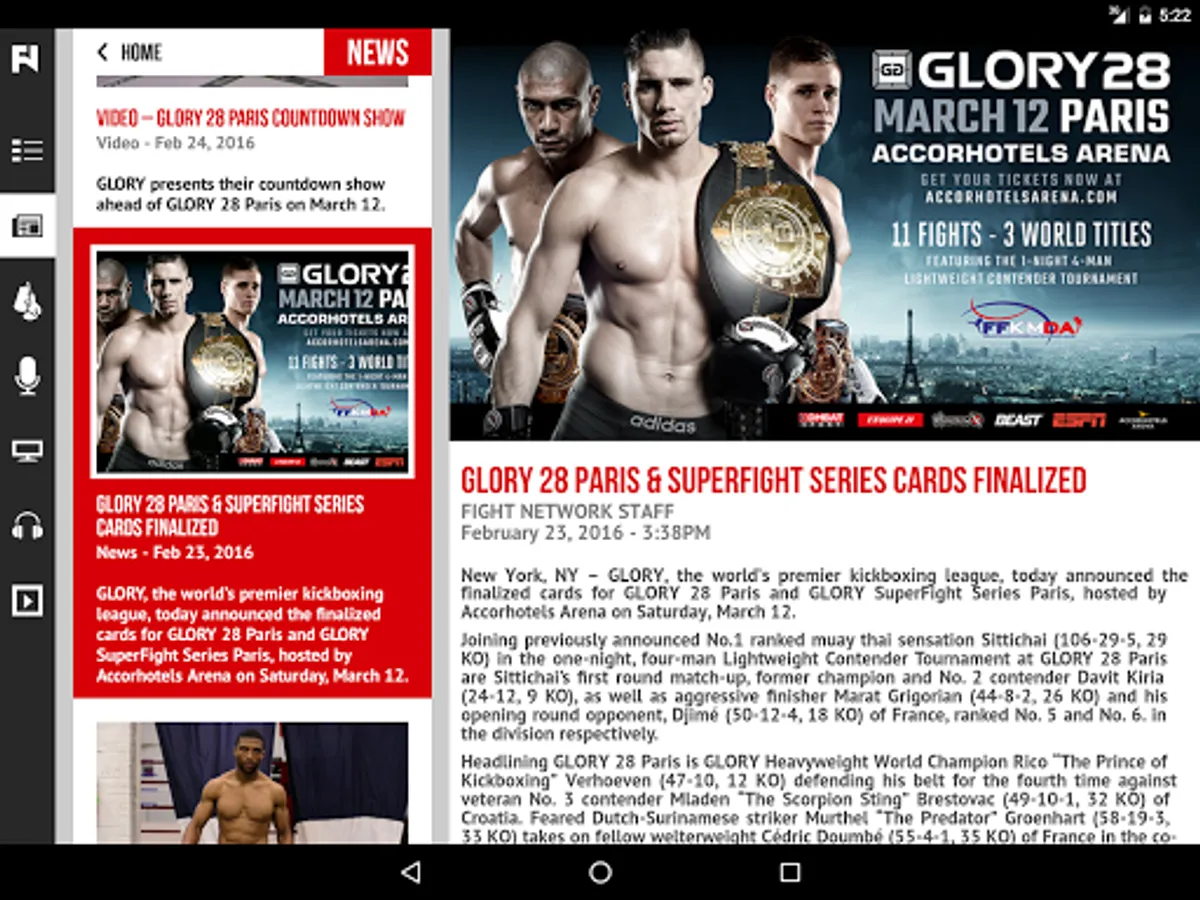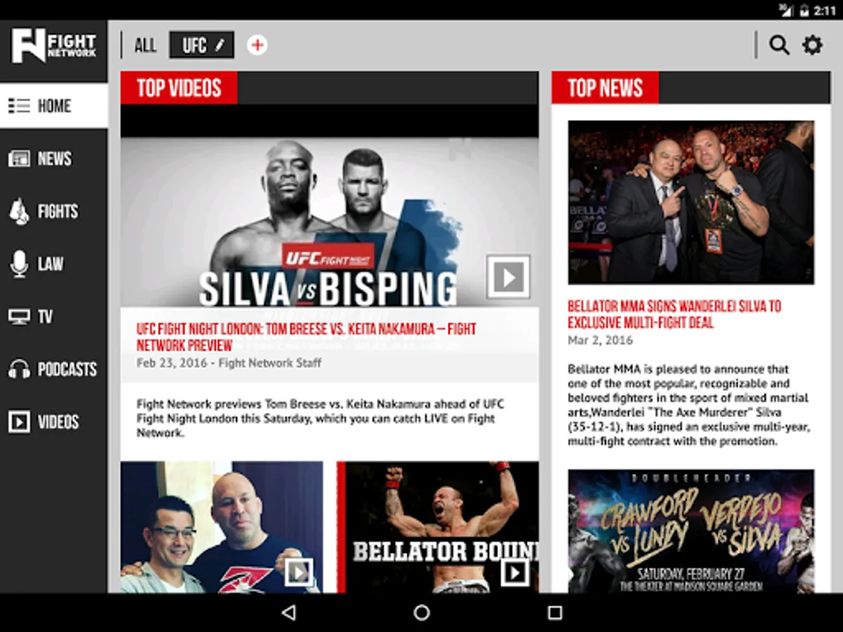 The app features the latest content from Live Audio Wrestling (The LAW), breaking news, original video and podcasts, detailed combat sports calendars, an extensive fighter database, contests and promotions, plus detailed programming information for the multi-platform combat sports network, which is distributed on cable, satellite and IPTV systems in the U.S., Canada and over 30 countries across Europe, Africa and the Middle East, as well as globally on digital platforms, including online, mobile apps and streaming devices.