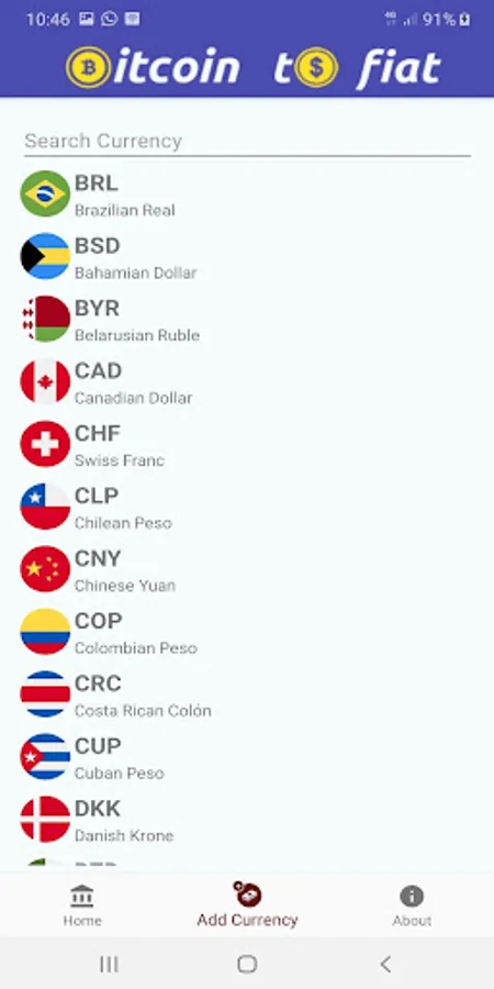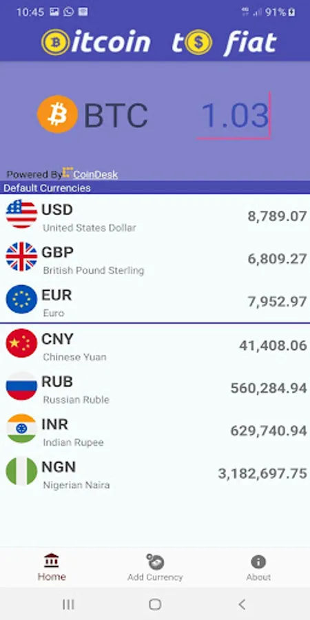 By default, the app displays the live Bitcoin price in 3 major currencies ie USD, GBP, and EUR but you can add up to 68 other supported local currencies.