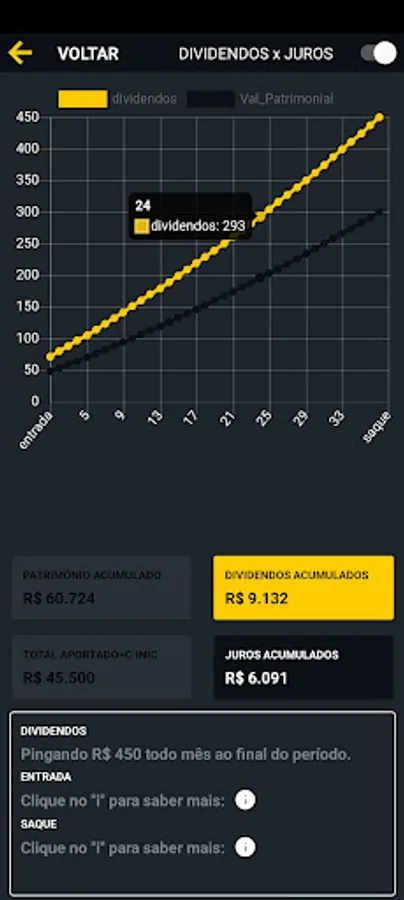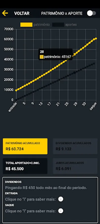 Inform how much you want to simulate, adding the initial investment, the monthly contribution, the rate of appreciation of your equity, the percentage to receive from dividends and for how long you want to invest. The result will appear in graphics and didactic information.