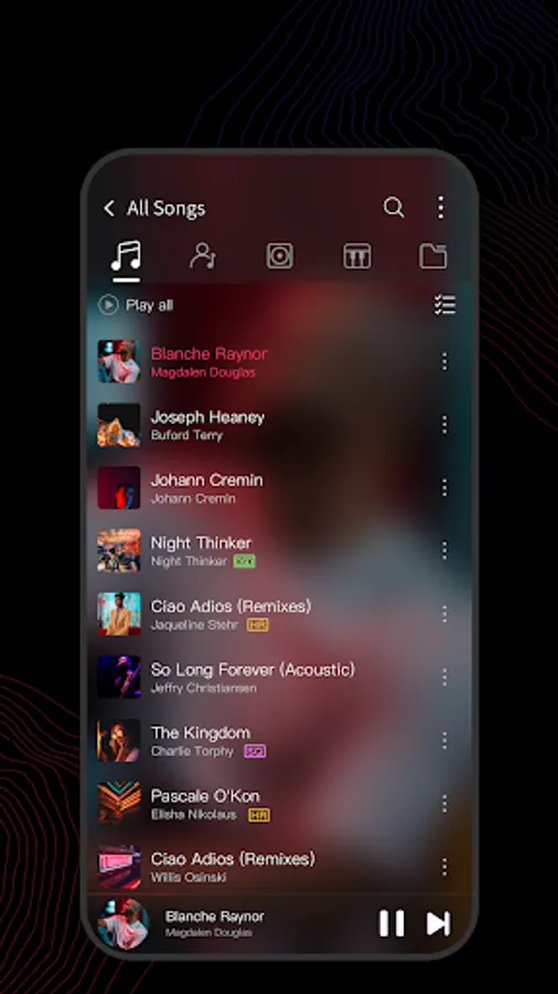 5.Supports playing all songs, playing by album (sorted by track no.), artist, genre, folder, custom playlist, etc.