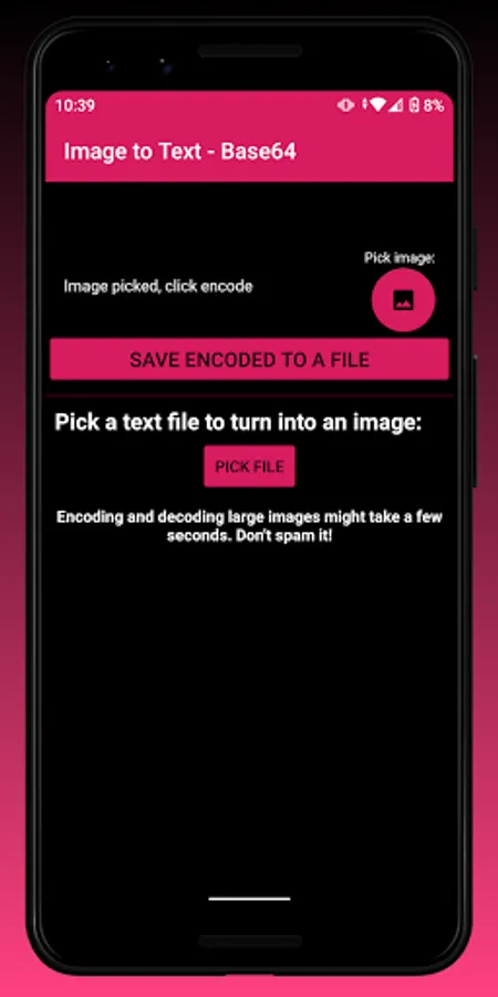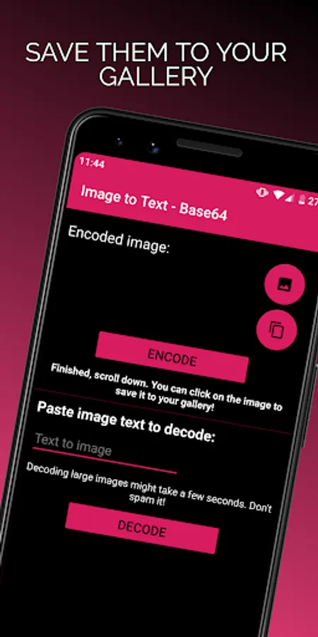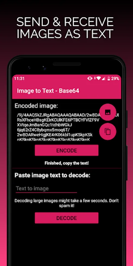 Image to Text - Base64 allows you to transfer any image into text that you can copy and send to your friends. They will have to transfer it back to an image using this app and will be able to save it to their gallery.