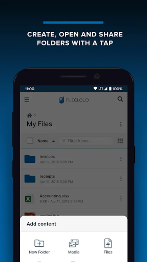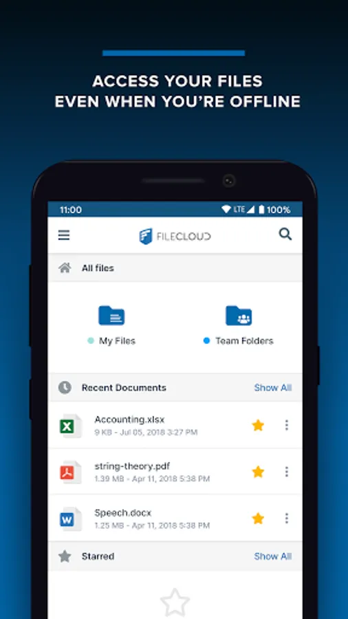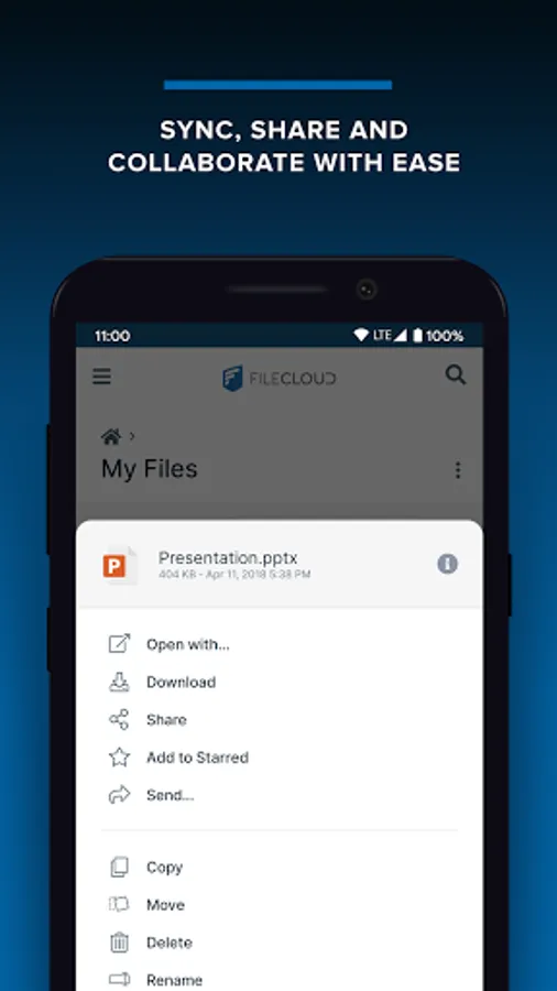 FileCloud offers seamless mobile access to the existing network shares in your organization. Instantly make your organization’s existing file shares remotely accessible. Users can access their files anytime, anywhere. Immediately open documents, files, and folders that are stored on your Enterprise FileCloud. Experience fast, easy, and secure access and ability to share company files and documents with Android devices.
