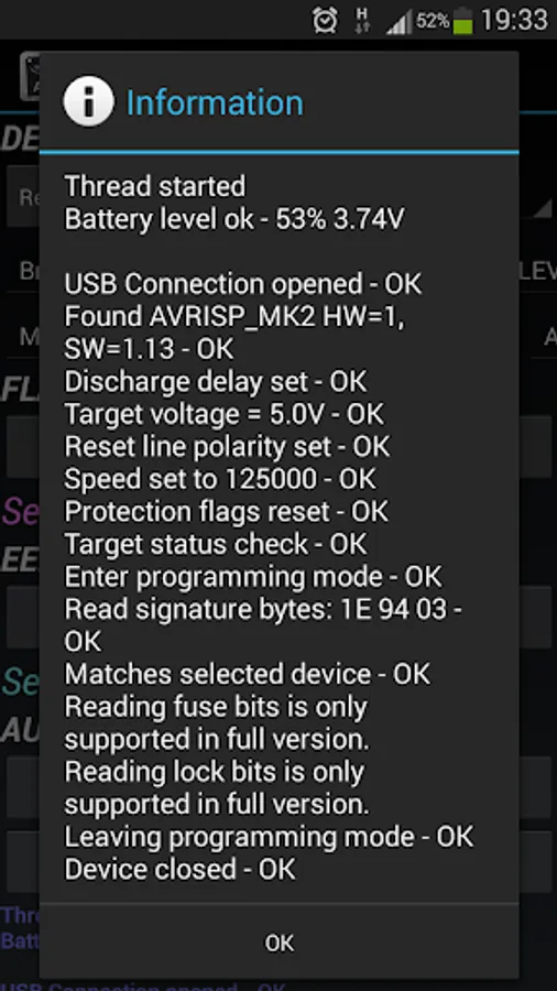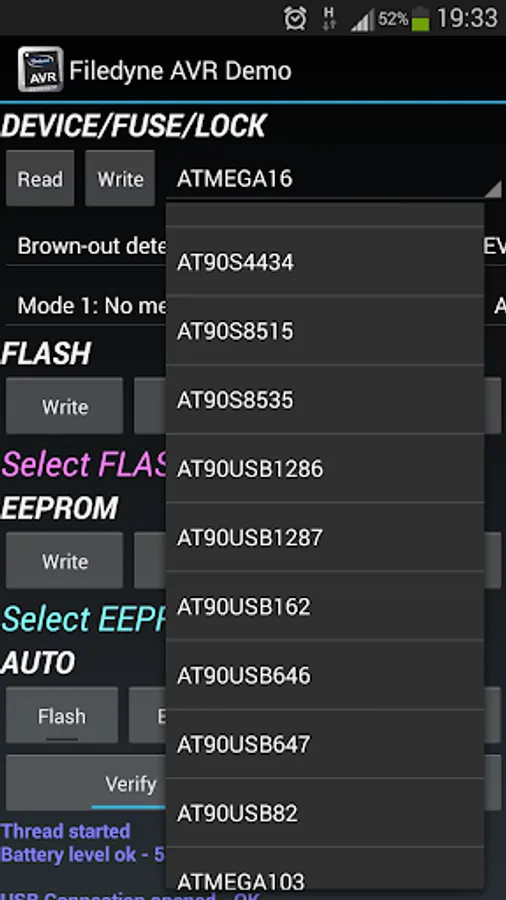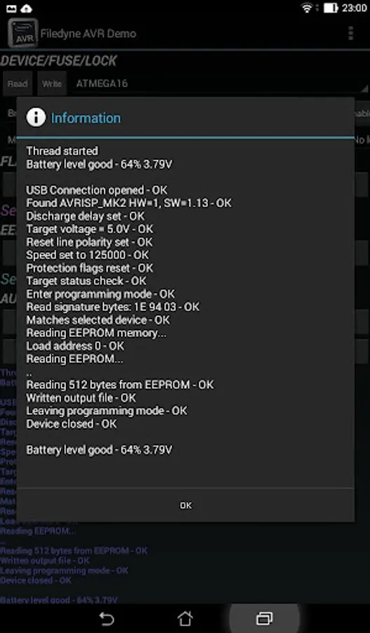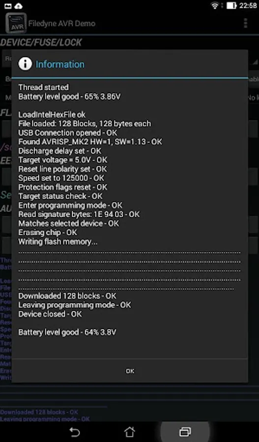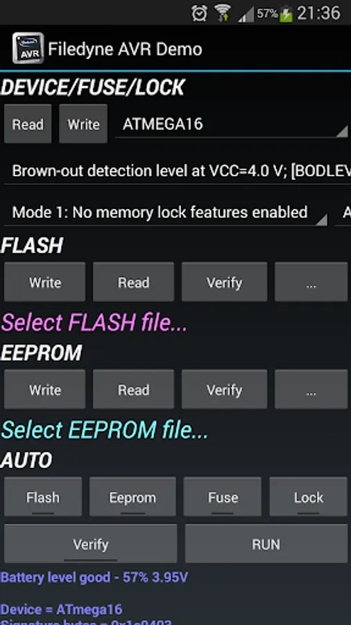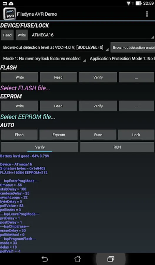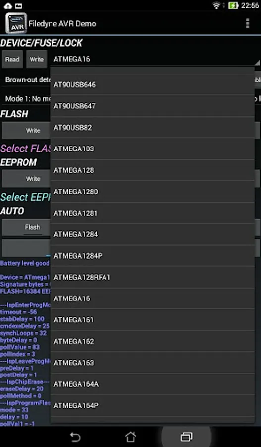 Filedyne AVR Demo is a tool for programming / upgrading AVR devices, using AVRISP mkII interface and USB OnTheGo(OTG) adapter.