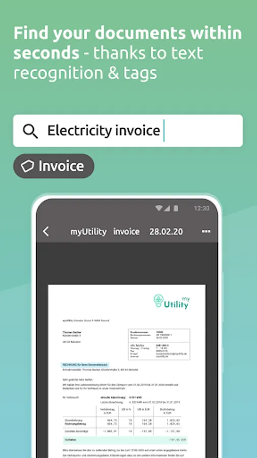 Find instead of search: you easily found your smartphone bill, your customer ID or your landlord’s contact information. Search for keywords, document types, dates or document names. With the full-text search, you can search for details or for all documents containing a specific word.