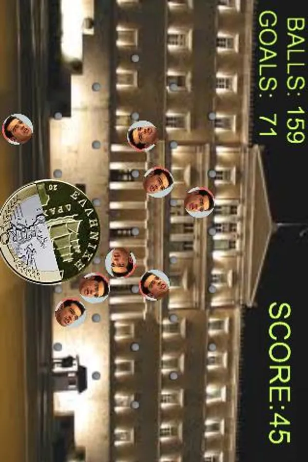 a greek version of pachinko game with Athens Parliament background and the party leaders as actors -- Click to create balls try for maximum goals with 300 shoots