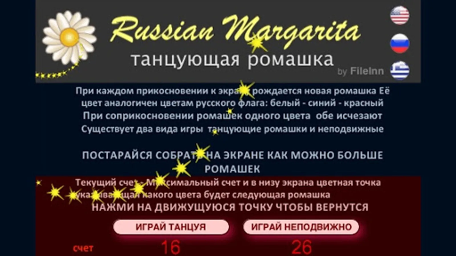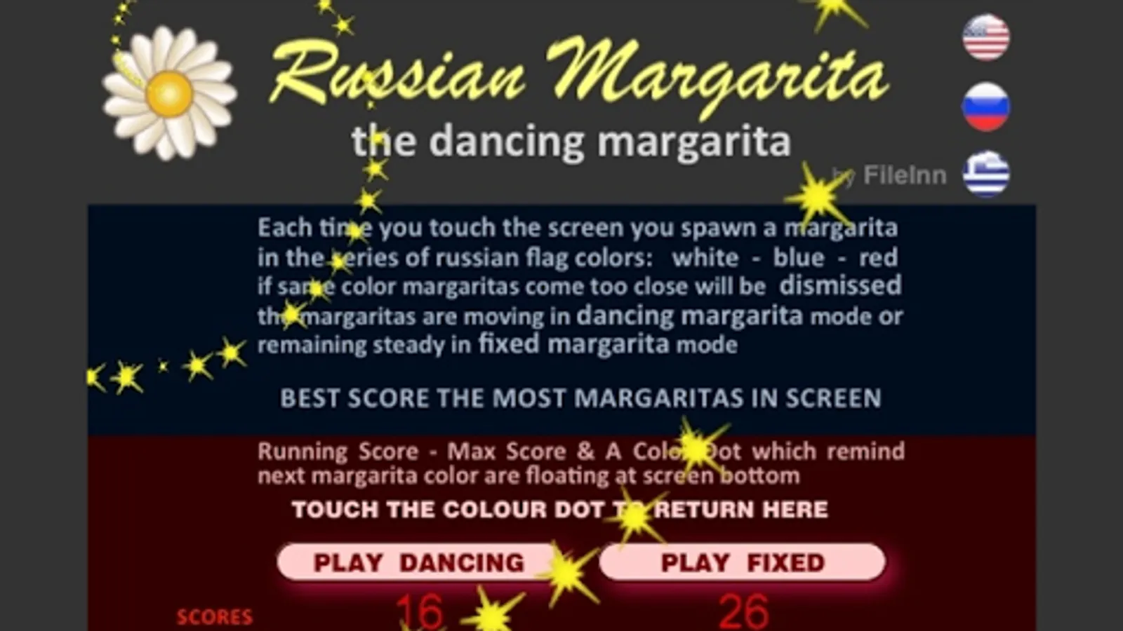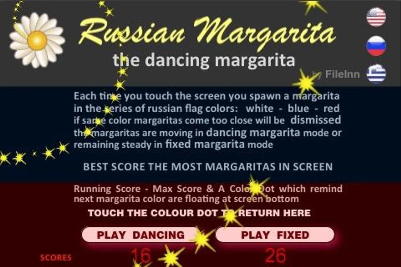 Each time you touch the screen you spawn a margarita in the series of russian flag colors: white - blue - red - if same color margaritas come too close will be dismissed - the margaritas are moving in dancing margarita mode or remaining steady in fixed margarita mode - BEST SCORE THE MOST MARGARITAS IN SCREEN ( Instructions: ENGLISH - RUSSIAN - GREEK )