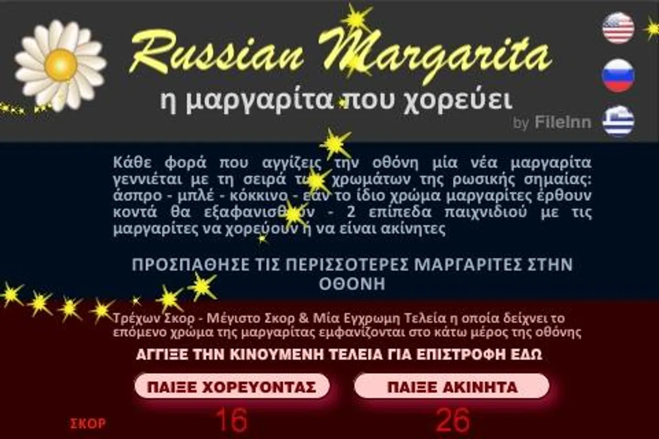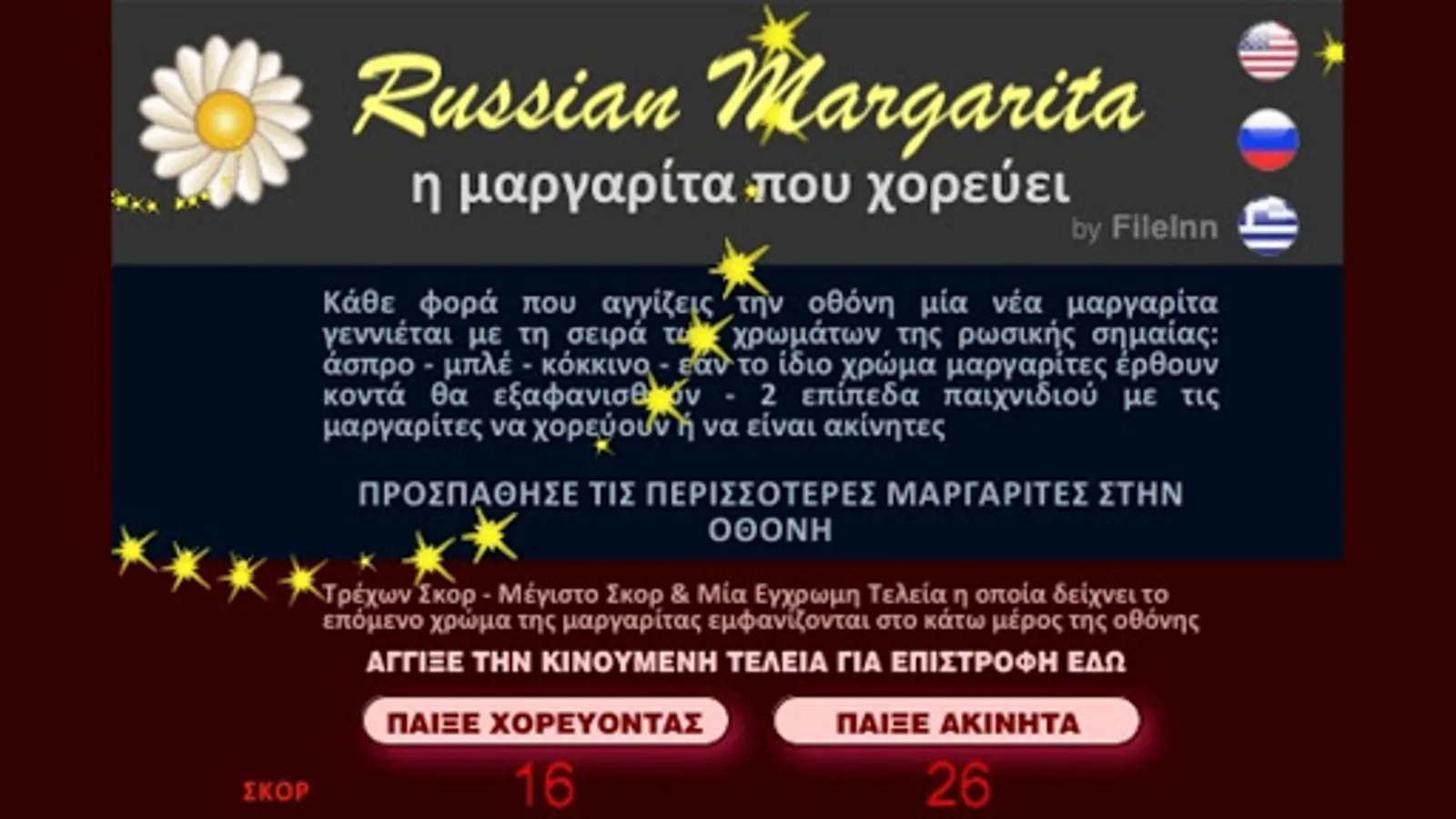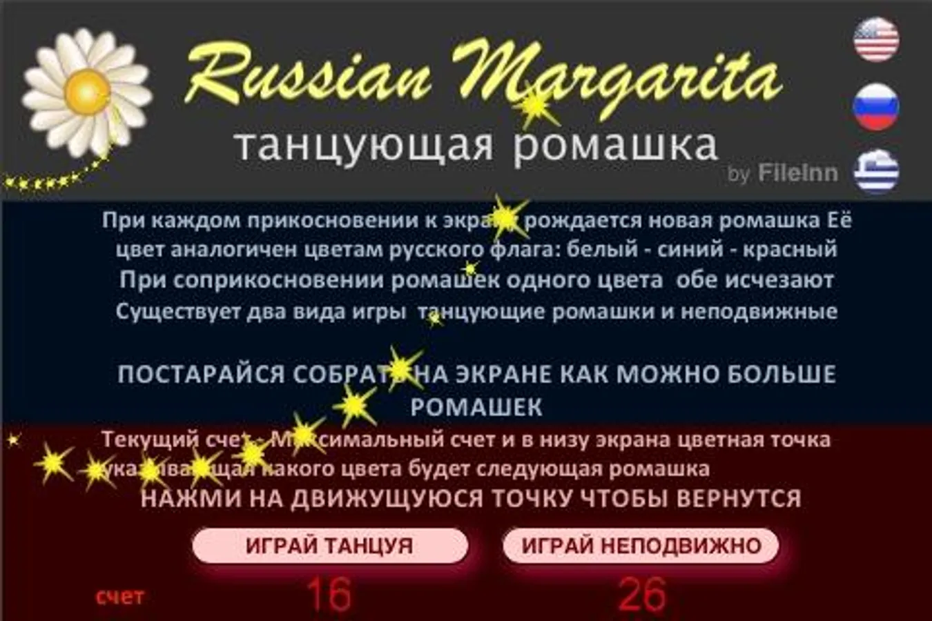 Each time you touch the screen you spawn a margarita in the series of russian flag colors: white - blue - red - if same color margaritas come too close will be dismissed - the margaritas are moving in dancing margarita mode or remaining steady in fixed margarita mode - BEST SCORE THE MOST MARGARITAS IN SCREEN ( Instructions: ENGLISH - RUSSIAN - GREEK )