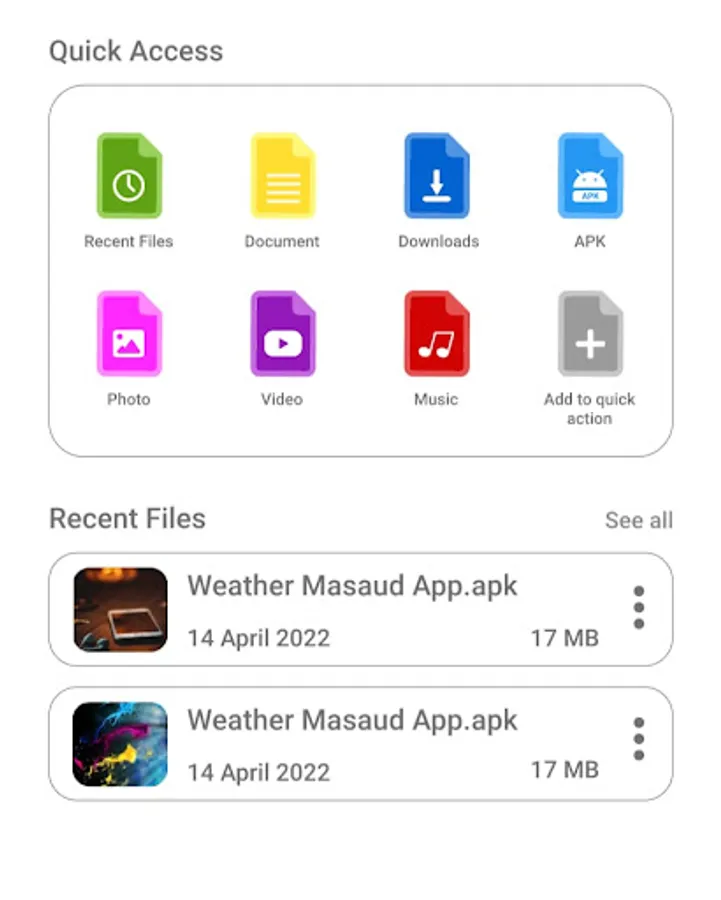 File Manager and file explorer is developed for Android user to manage all mobile files easily and fast in a secure way. The user can see all files i-e Mobile applications, photos, videos, Apps and other documents, and rare files as well. The file manager performs multiple actions for the management of files which include playing, deleting, and sharing something. File Explorer includes a vault feature where user keeps their private picture and videos by applying a password.