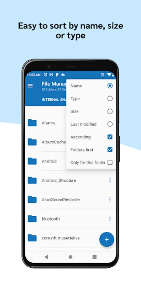 - Various Sorting Options are available to sort out the files and folder: Sort by name, size or type