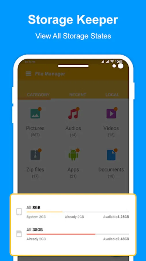 Storage. This application will manage your files efficiently. you'll be able to simply handle all your files weather they're hold on in your device memory or SD card.