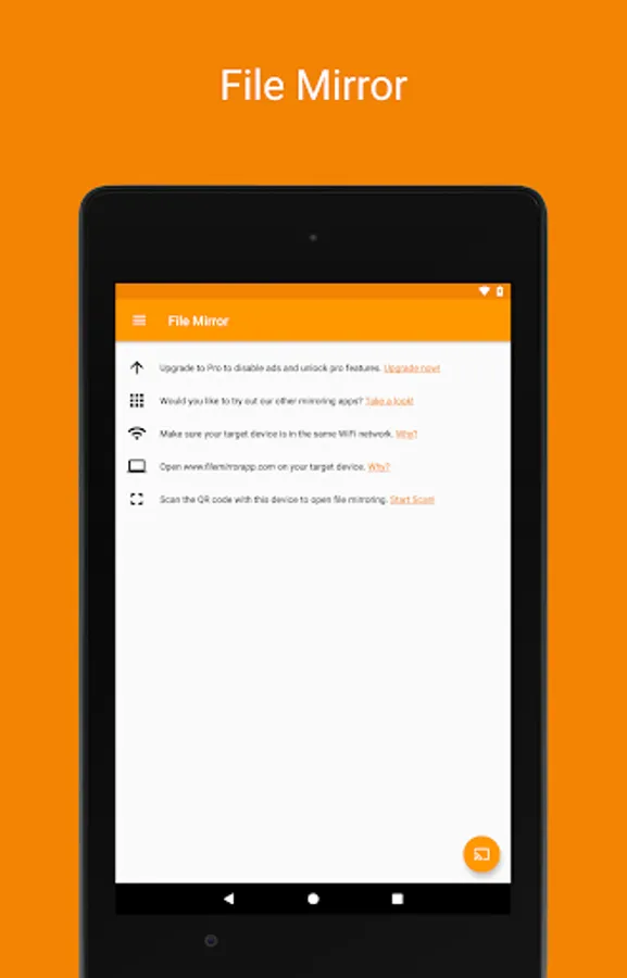 WiFi file transfer contains ads which will be shown before and at the end of each file mirror session and after changing the settings. To disable ads, consider updating to the pro version. This can be done in the side bar menu, just click on "Upgrade to Pro".