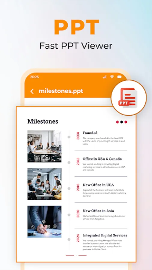 Open PDF, Word, Excel, PowerPoint, and text documents effortlessly.