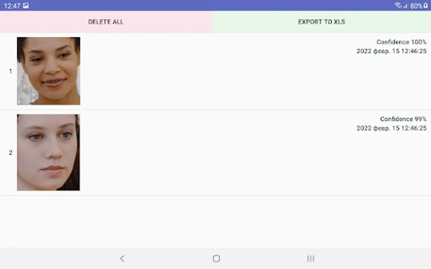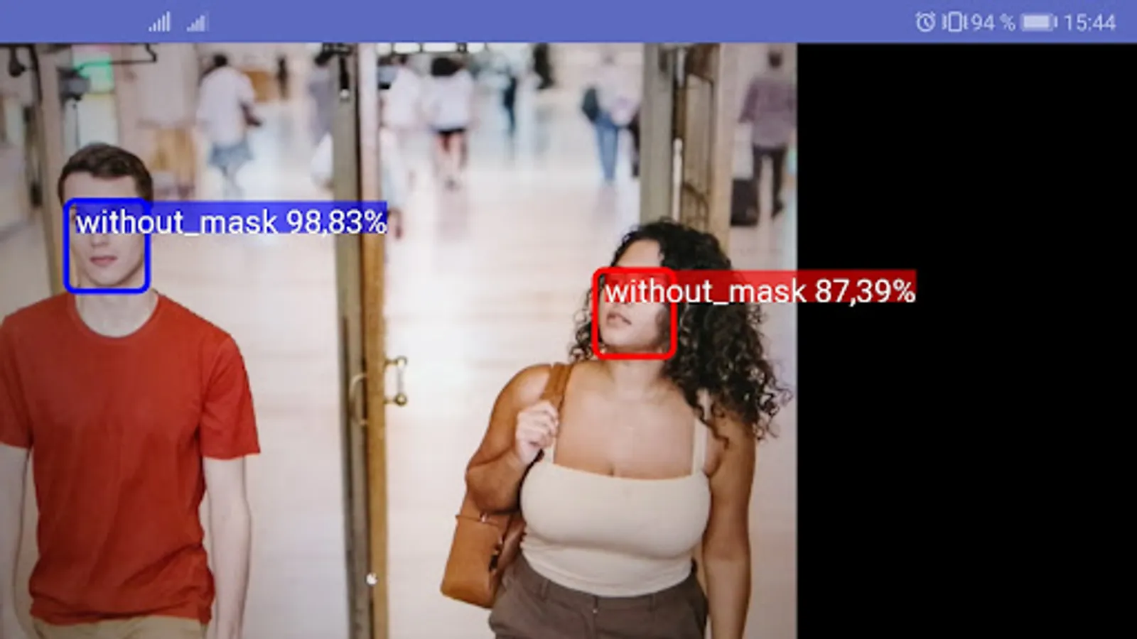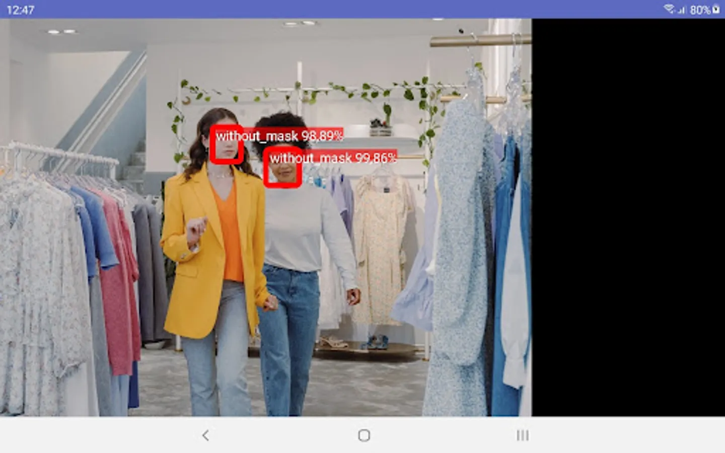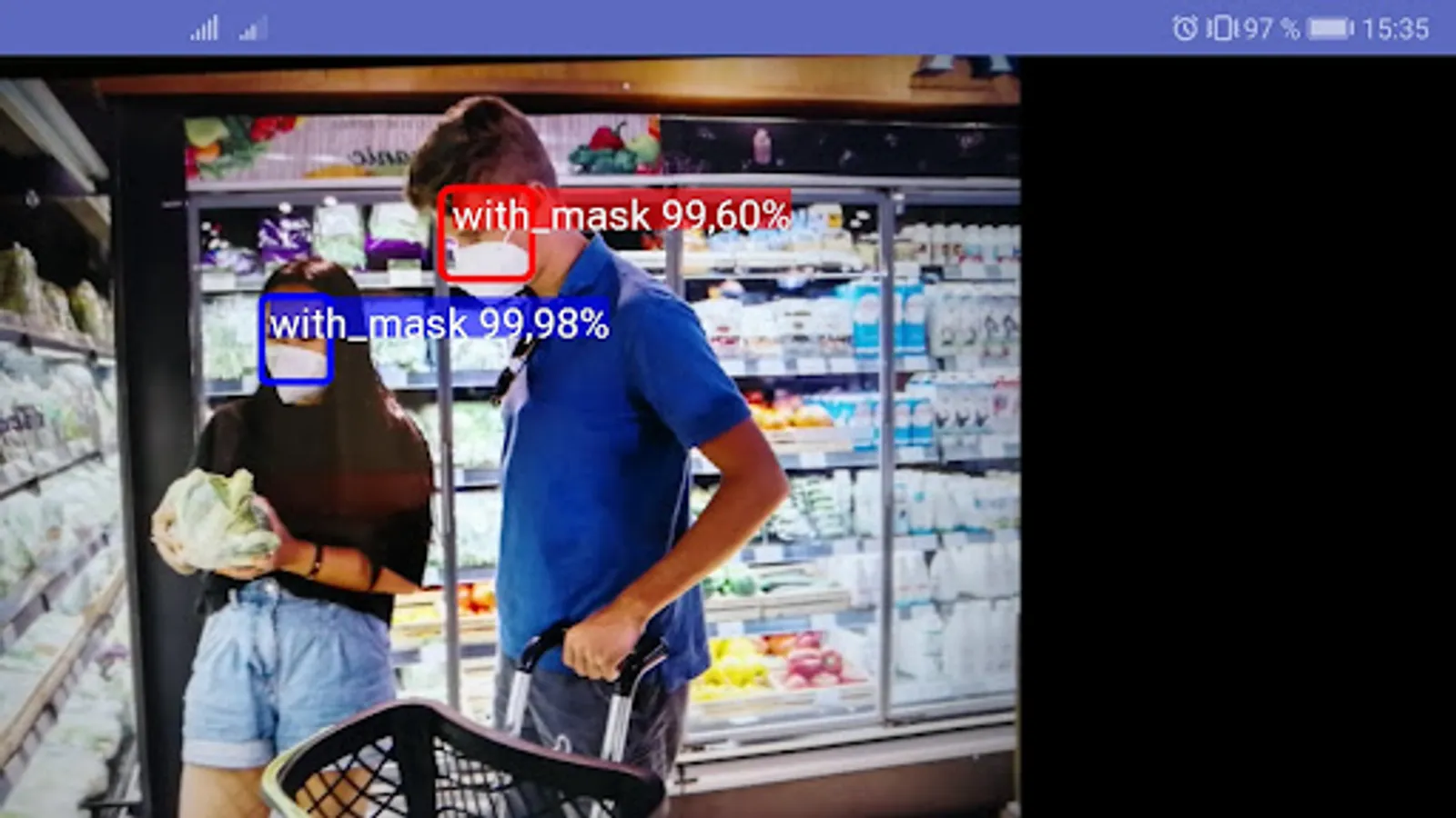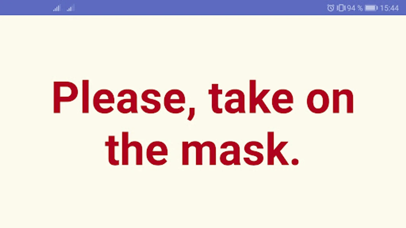 The application, using a neural network and the front camera of your device, detects people's faces, determines whether a person is wearing a mask or not, and displays a warning. The 30 most recently detections without mask are recorded in the database and are available for viewing.