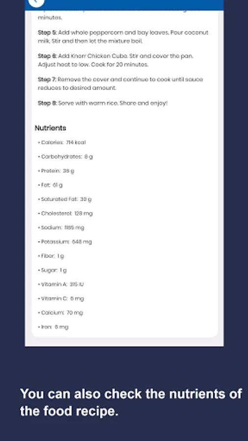 It provides a full details of the food with preparation time, cook time, ingredients, instructions and even nutrients.