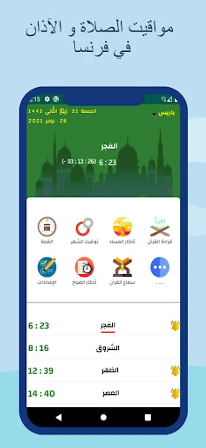 Prayer Times and Adan France is one of the best Islamic apps for the mobile phone because it has everything a muslim needs starting with prayer times and adan, reading and listening to the Noble Quran, up to the Adkar, the direction of Qibla and the Hijri calendar ...