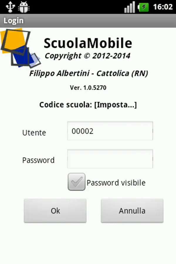 On first access is required to enter the ministerial code of the school detectable from the list of active schools at https://www.scuolawebromagna.it or by asking their school to the school secretary. To change the code after the school need to click on "School Code" at the login page.